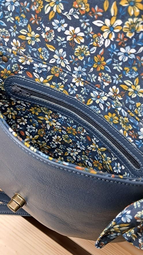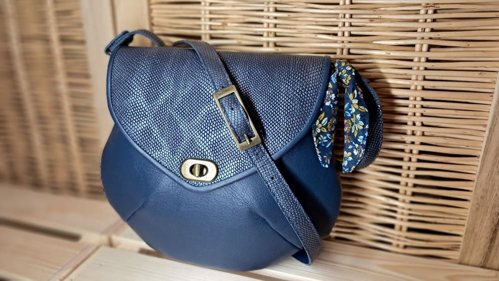 Sac besace bi color bleu et rabat bleu argent cuir et textile Dim 30×17