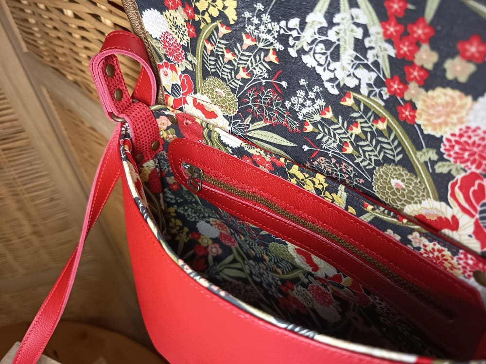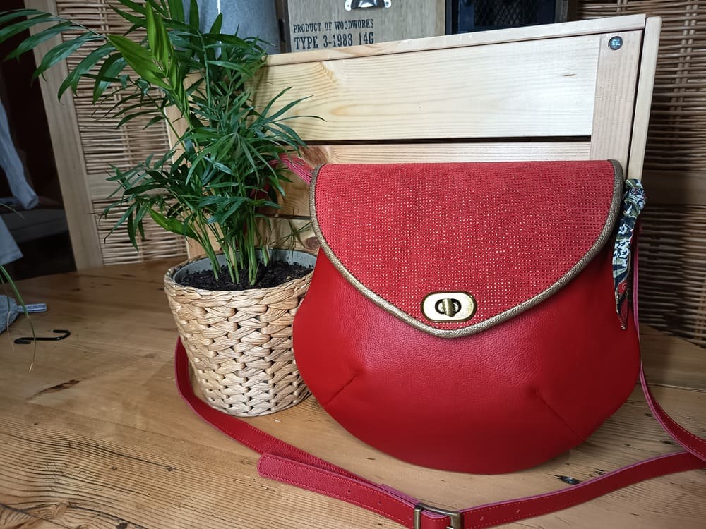 Sac besace bi-color rouge et rabat rouge brillant bronze cuir et textile Dim 30×17